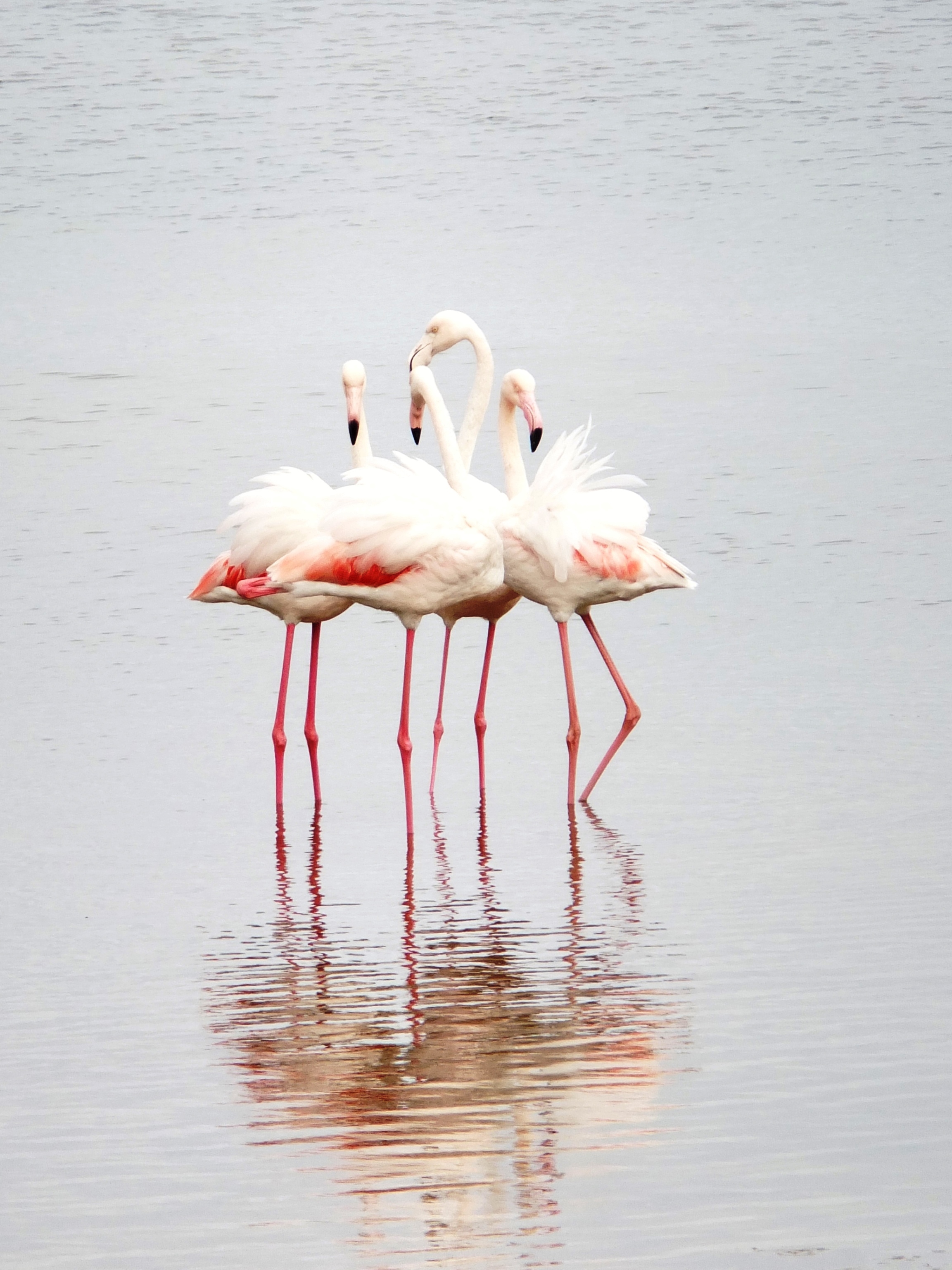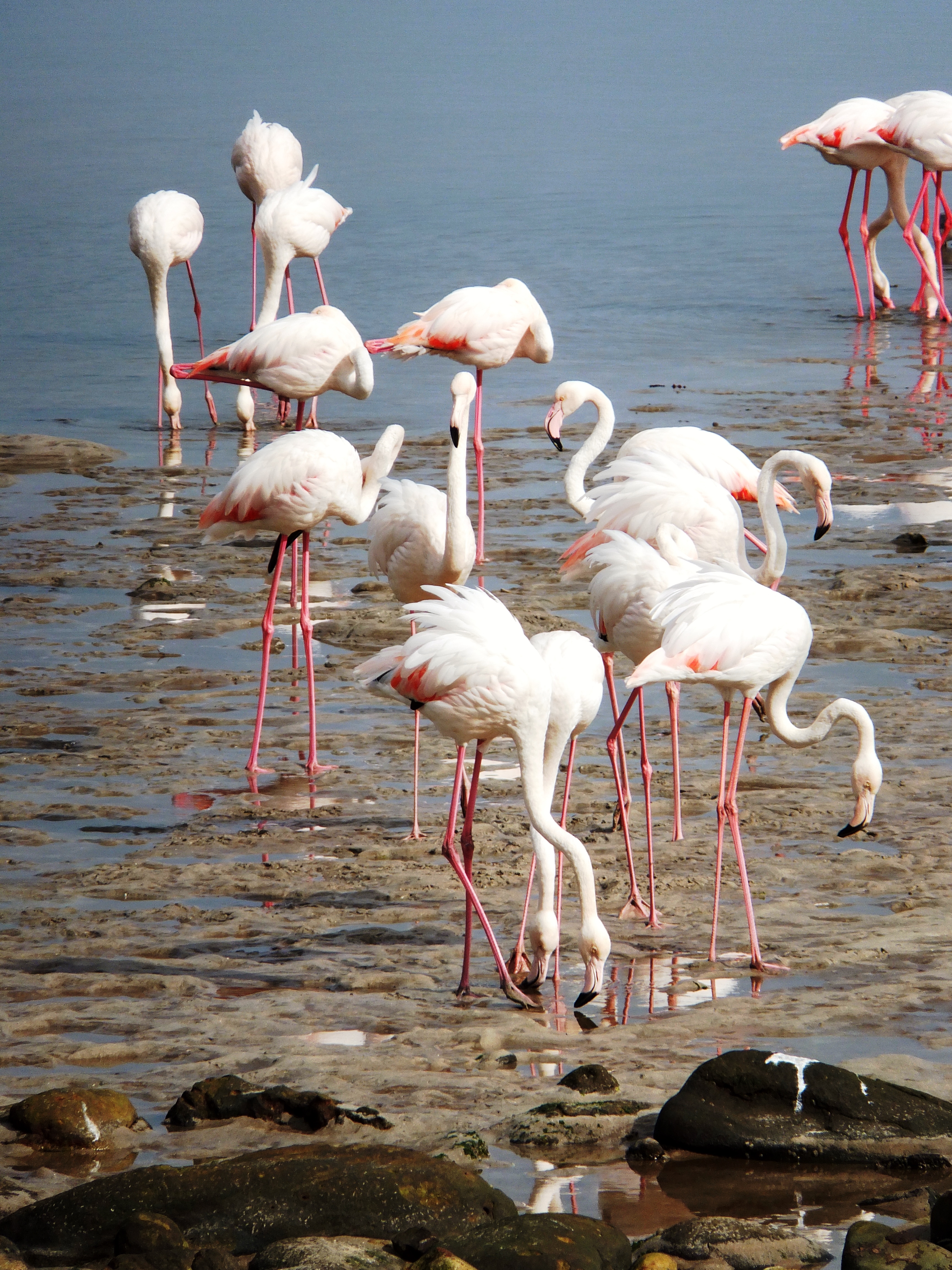 Stamping their feet while turning in a tight circle is a common sight in a flock of feeding greater flamingos. This aids in disturbing the sediment and the creatures within it.